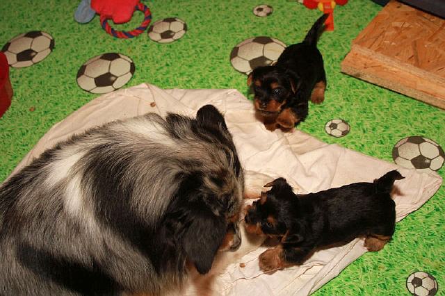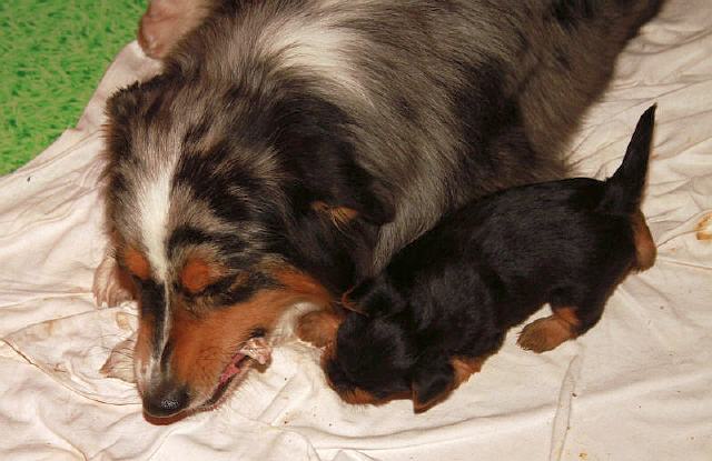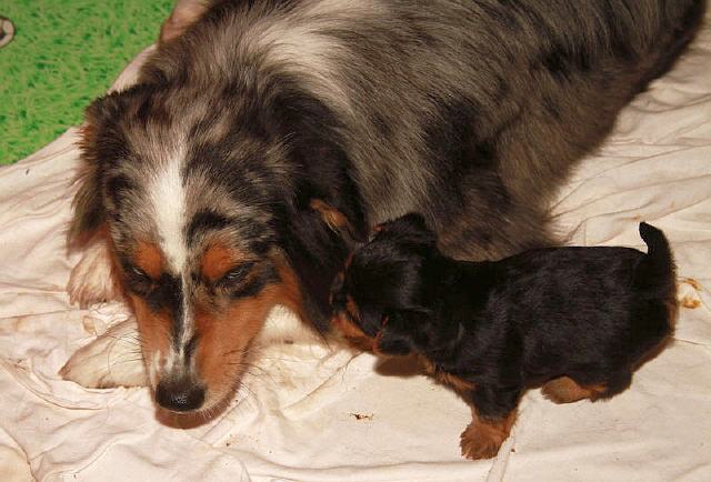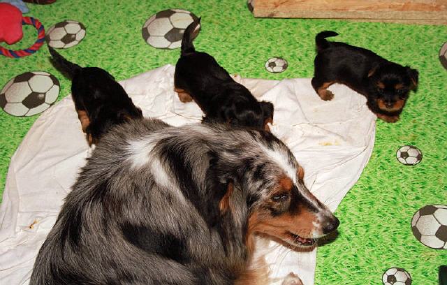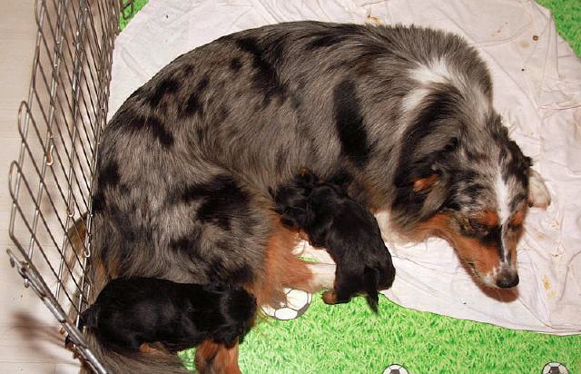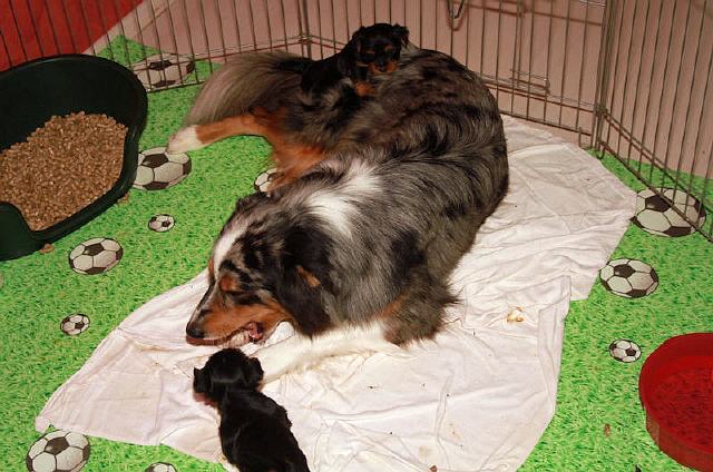 Unsere Australian Shepherd Hündin Suki mit Silkywelpen.